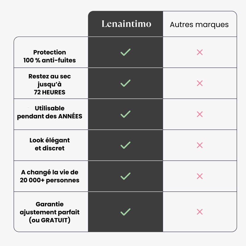 Nous avons conçu Lenaintimo pour dépasser les culottes anti-fuites classiques en confort, protection et confiance. Voici la comparaison.